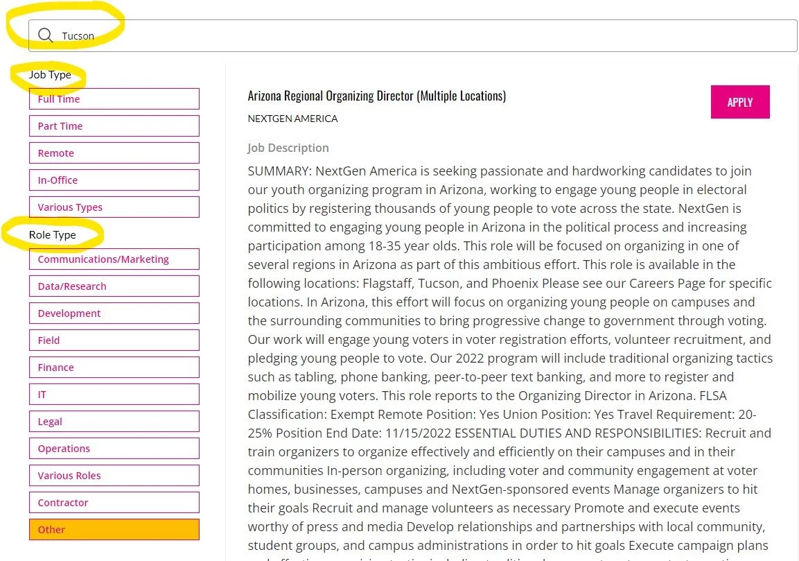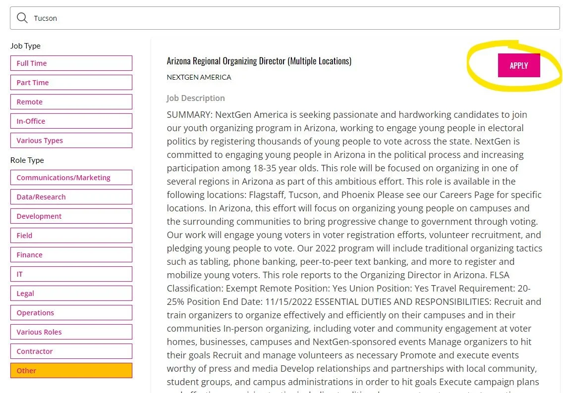 Once on the homepage, you’ll see all the jobs posted on our job board, and scroll down to see all the organizations that are hiring OR you can search for keywords such as cities names like “Tucson”, job type like “remote”, job role like “operations” or job title like “campaign manager”. Or you can click on the left-hand side bar on the various job types and role types.