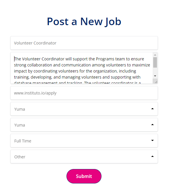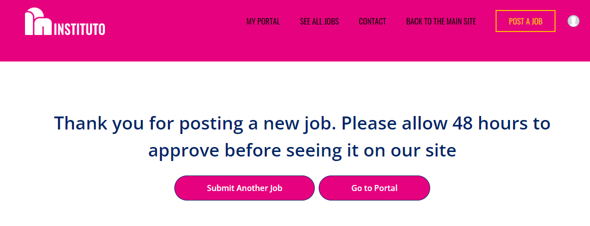 Once submitted, allow 48 hours for approval before seeing it on our site. All jobs submitted by employers will be either approved or denied by the Instituto staff. Check back to our job board to see if your job was posted by searching your job title in the job title. After approval, your job posting will be live for 60 days until it expires.