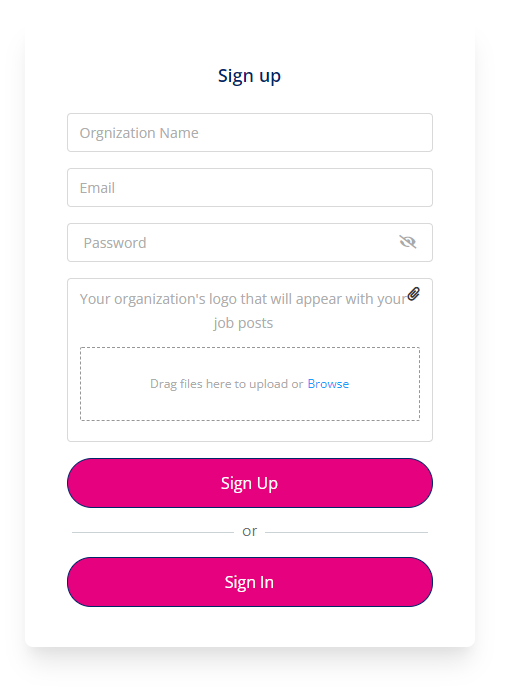 Input your organization's name, email, password, and organization logo, and click "sign-up".